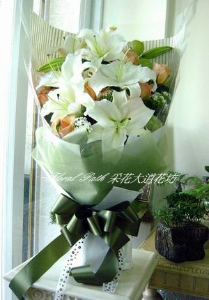[主 花 材] 香檳玫瑰11朵 香水百合9朵 唐棉